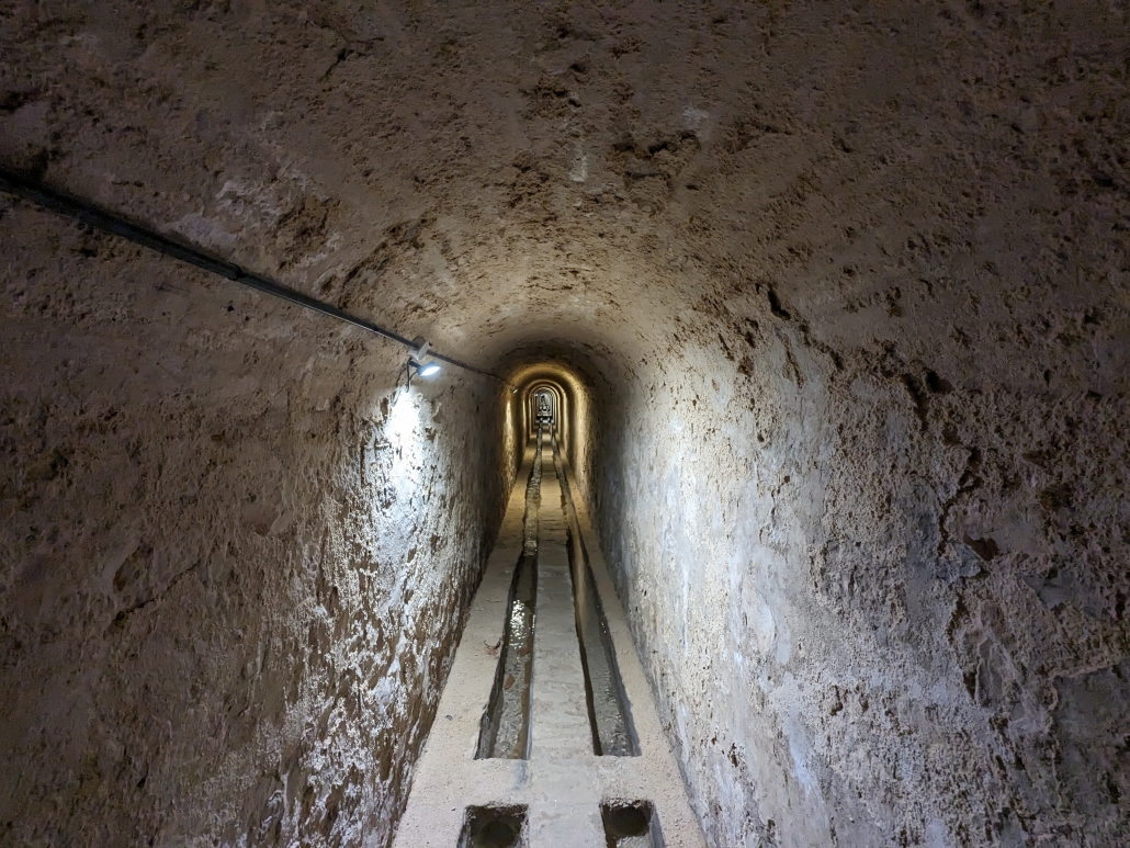 En el éxtasis de lo natural, el agua se despliega en su pureza cristalina, sin haber sido tocada por la mano del tratamiento, un regalo del propio diseño de la fuente que nos deja maravillados. Y en nuestro paseo, alcanzamos un rincón donde el camino parece detenerse. Nos encontramos con los túneles que se pierden en la oscuridad sin promesa de salida. Entre estas paredes misteriosas, descubrimos una sala singular, donde el sonido se convierte en un cómplice de la magia. Si dos personas se posicionan en puntos opuestos, serán testigos de fenómenos acústicos que susurran secretos y melodías que solo estas dos personas pueden interpretar.